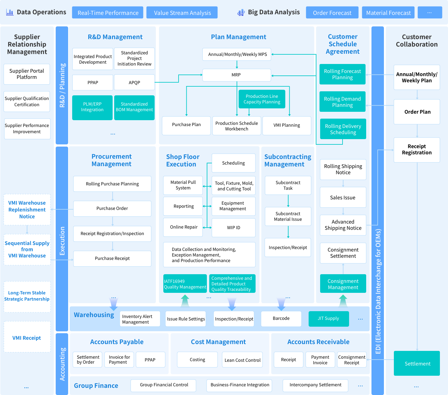 Rolling production plans steer shop-floor execution. Coupled with total-quality management, the system supports lean manufacturing and end-to-end traceability, meeting IATF 16949 requirements